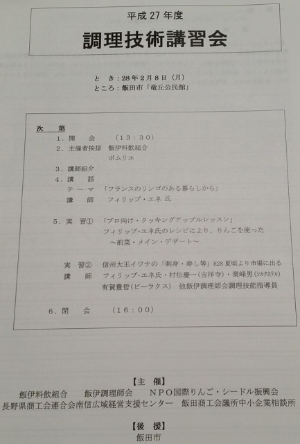 飯伊地区の調理師の皆さんの定期講講習会と連携した「プロ向けクッキング・アップルレッスン」を2月8日に飯田市竜丘公民館にて開催しました。